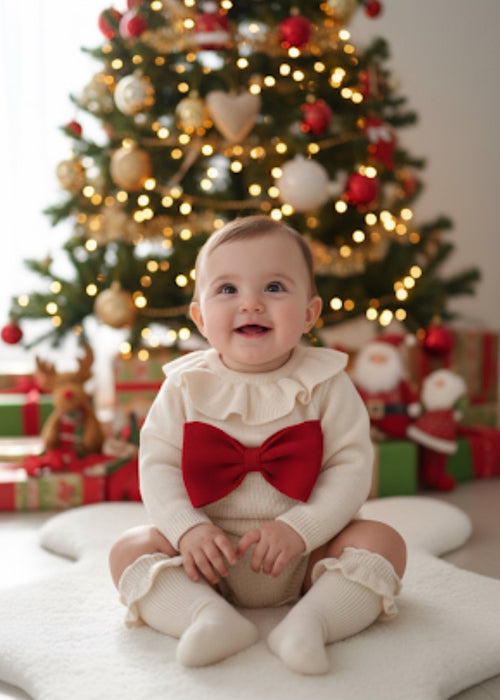 %100 Pamuk Kırmızı Triko Kurdele Detaylı Bebek Romper & Çorap Seti | Yılbaşı Kıyafeti