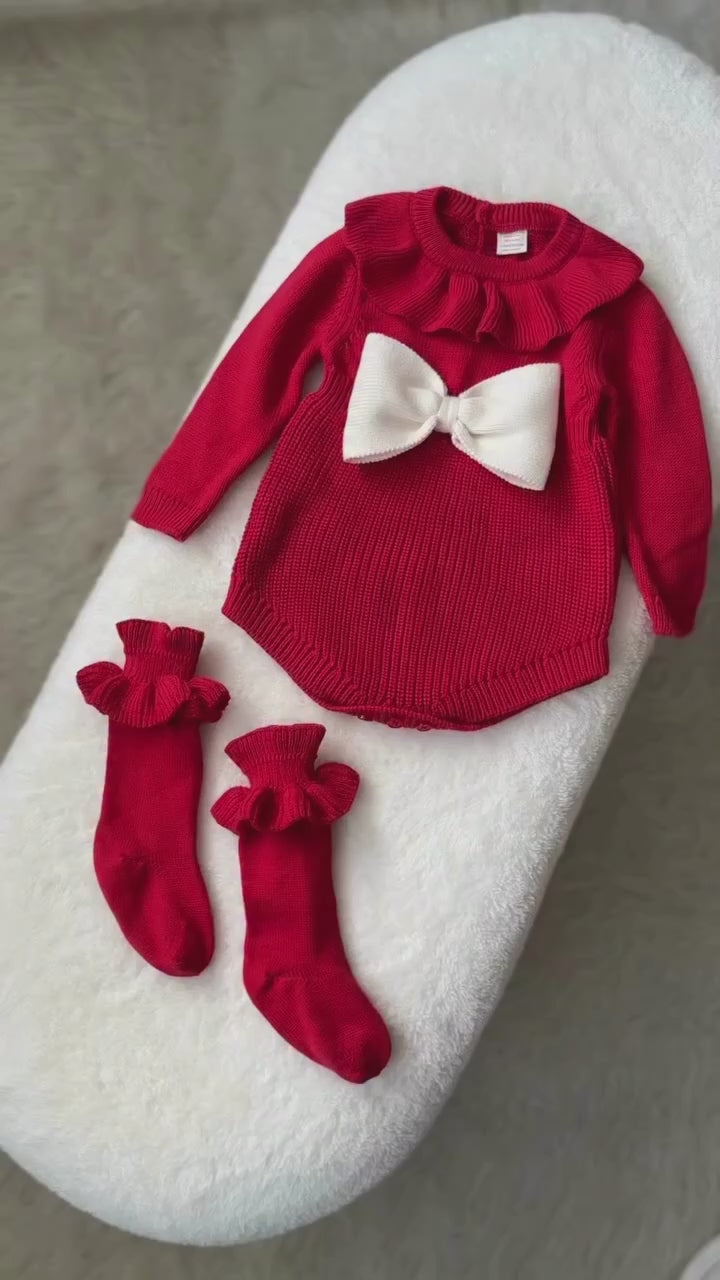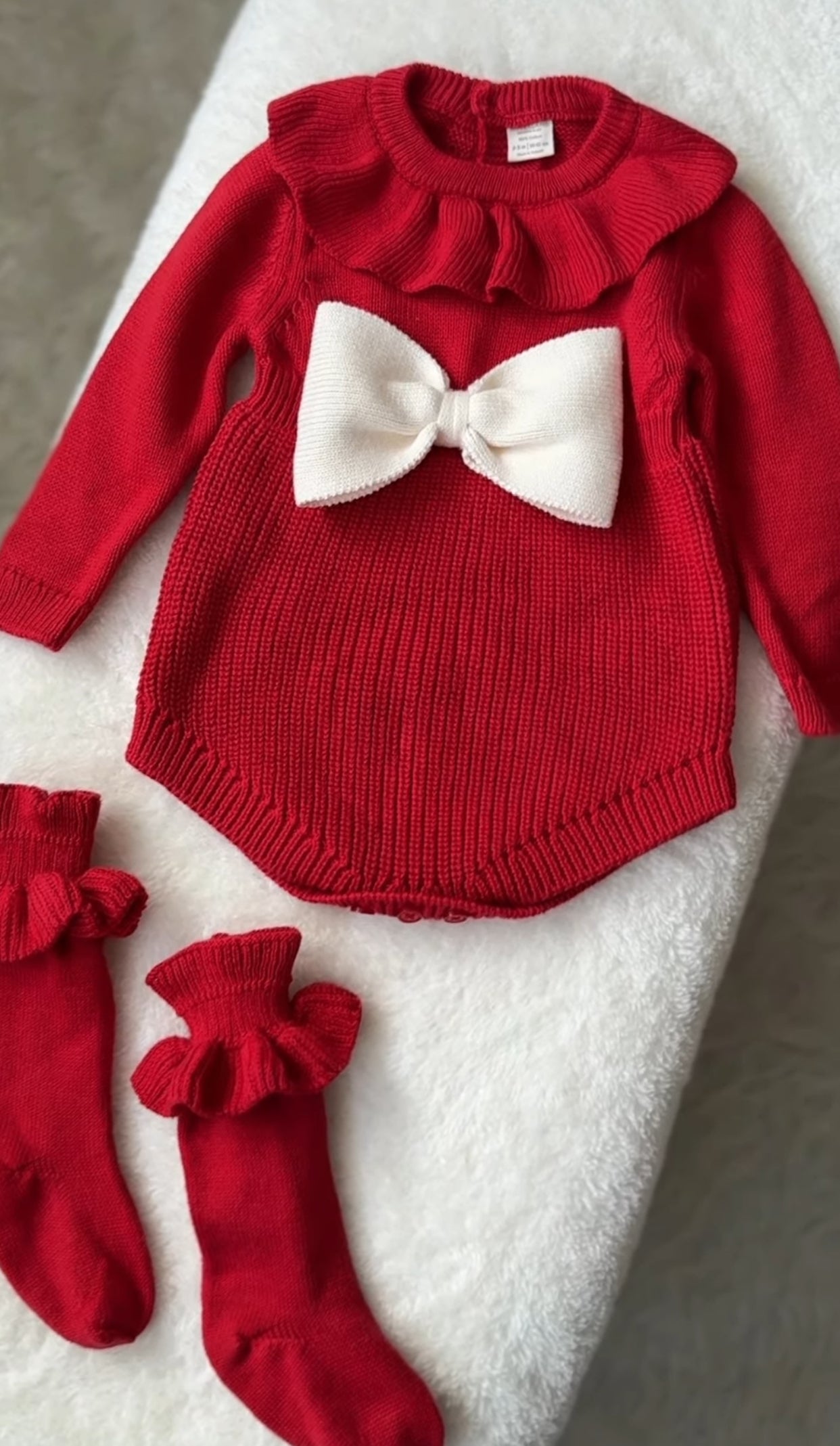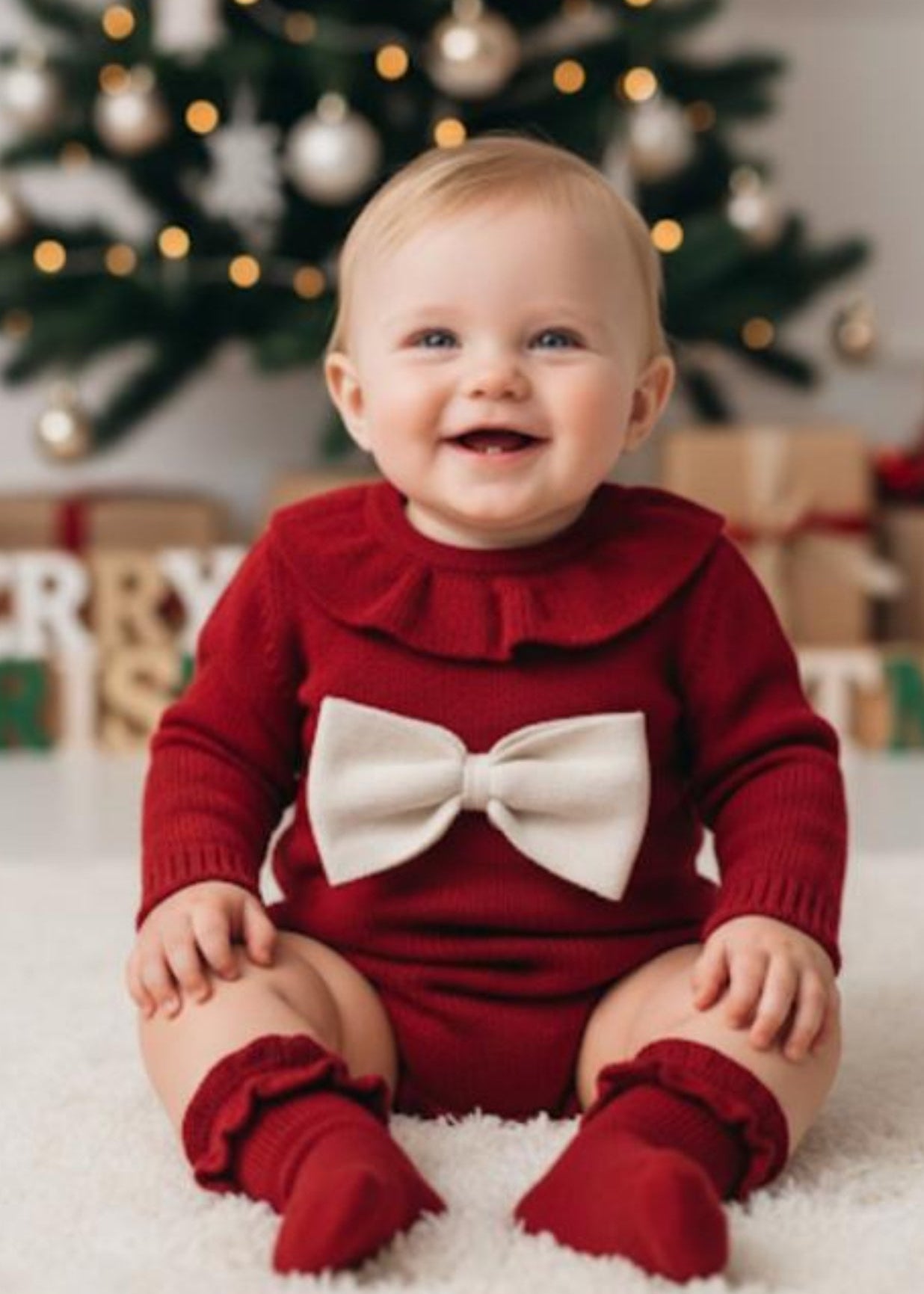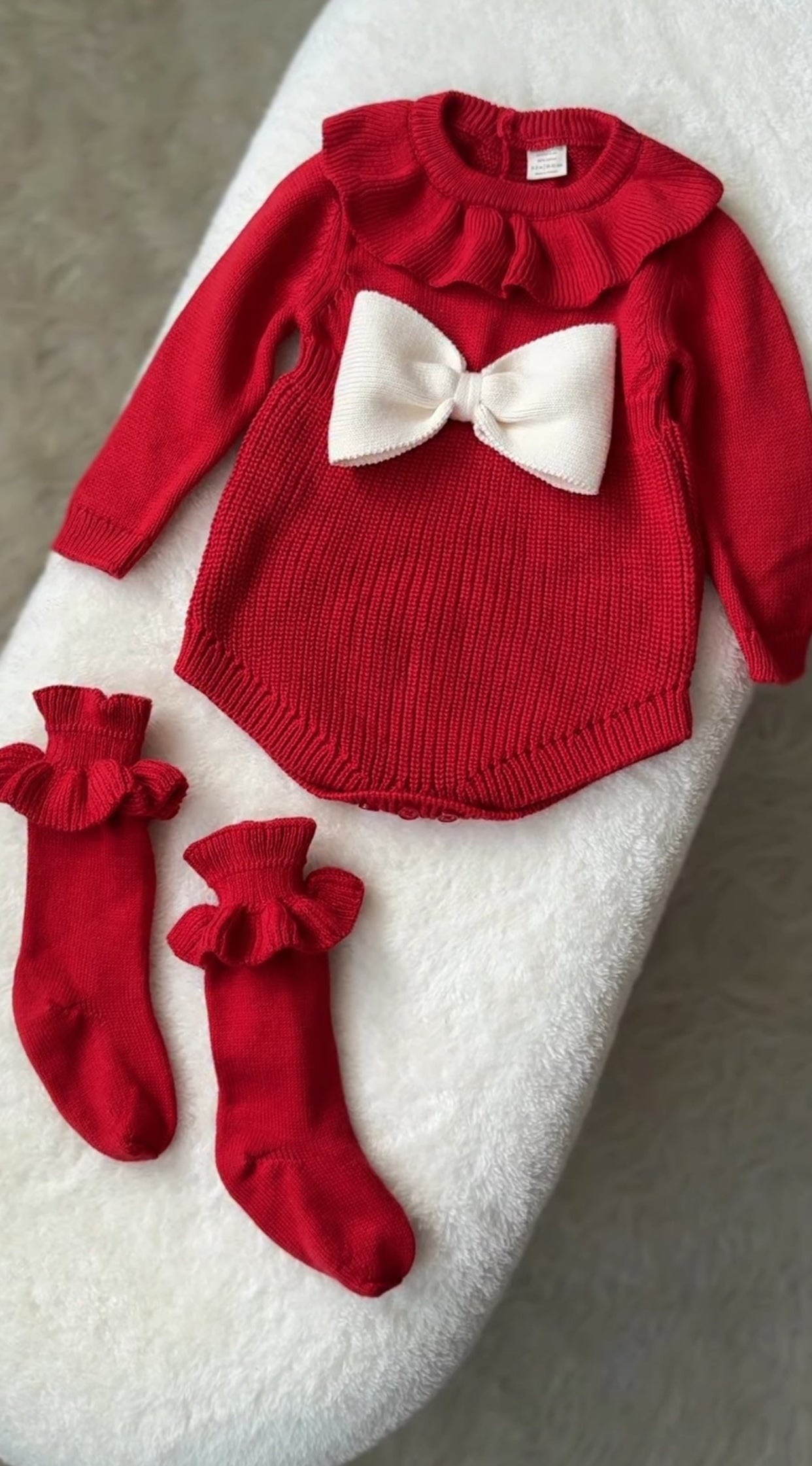 %100 pamuk iplikten üretilmiş kırmızı triko bebek romper ve çorap seti, yılbaşı konsepti için özel olarak tasarlandı. Yumuşacık dokusu sayesinde bebeğinizin hassas cildine zarar vermez. Kurdele detaylarıyla zarif bir görünüm sunarken, şık tasarımıyla hem günlük kullanım hem de özel çekimler için idealdir.