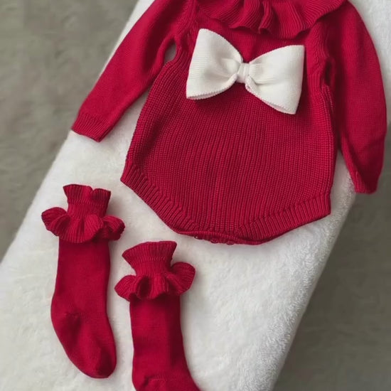 %100 Pamuk Kırmızı Triko Kurdele Detaylı Bebek Romper & Çorap Seti | Yılbaşı Kıyafeti