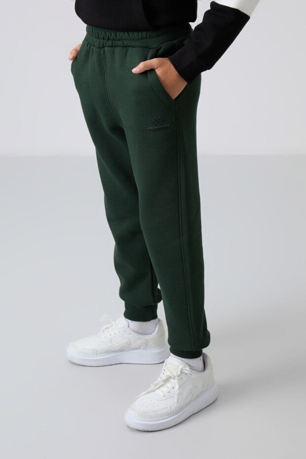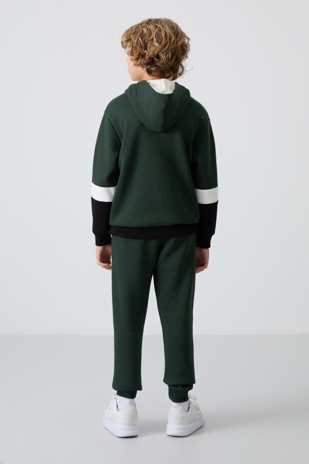 Çam Yeşili Kapüşonlu Ekru Ve Siyah Geçişli Erkek Çocuk Eşofman Takımı