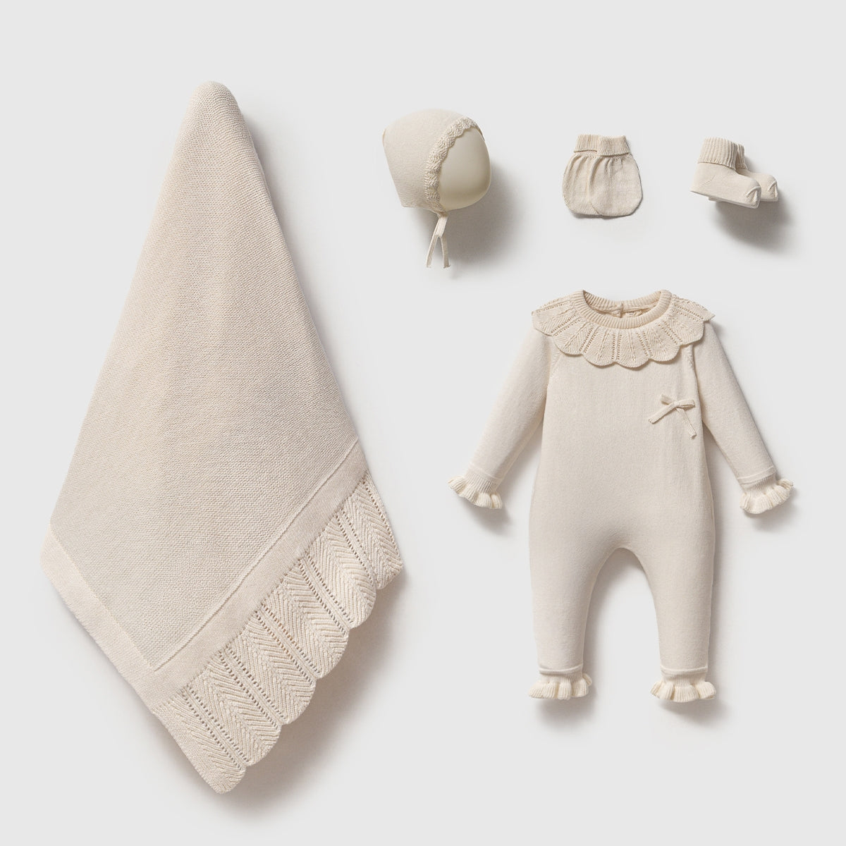 Kişiselleştirilebilir 5 Parça Triko Yenidoğan Kız Bebek Hastane Çıkış Seti – Krem | Battaniyeli, İsme Özel Set 8385N