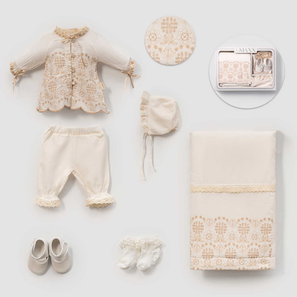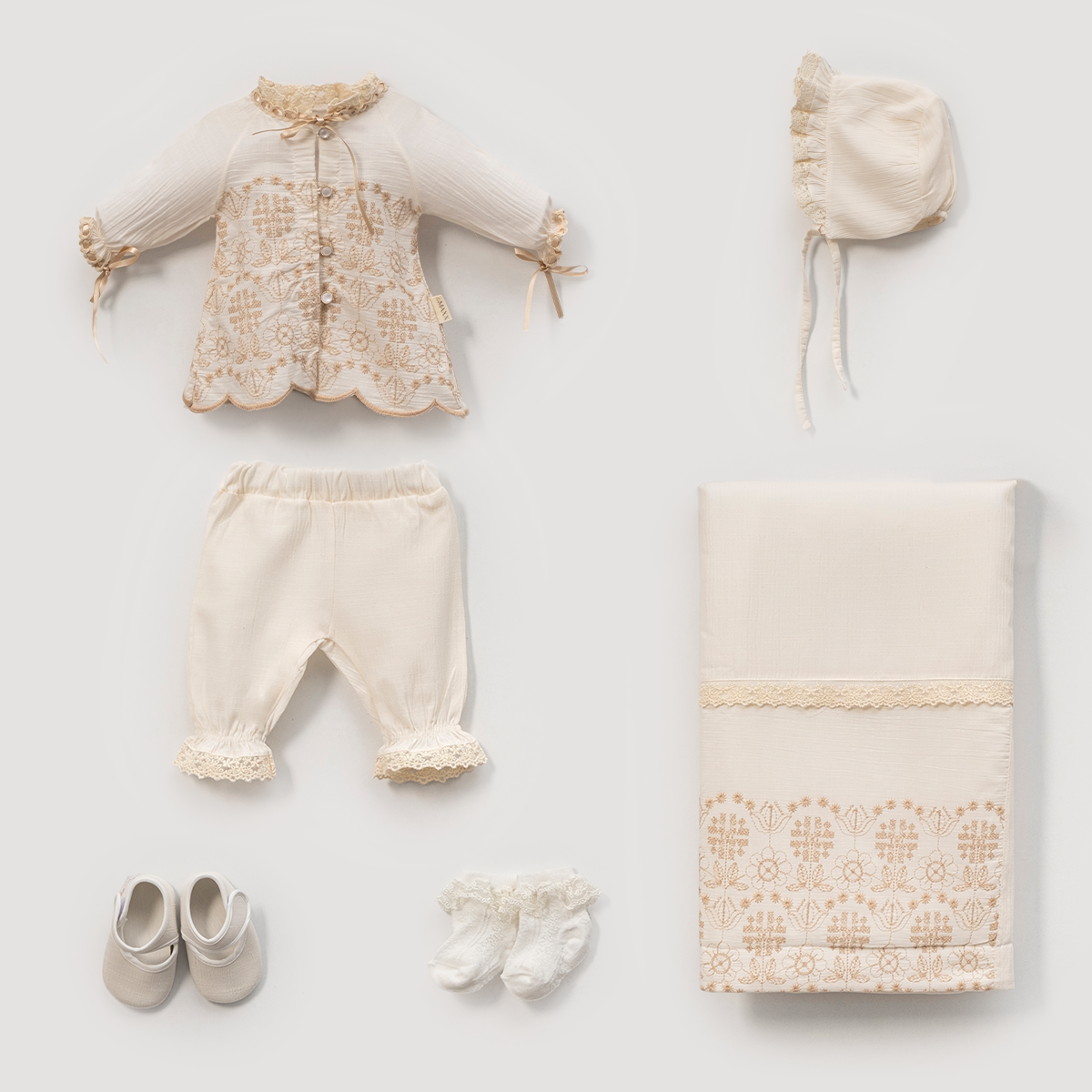 Zarif detaylarıyla öne çıkan bu dantelli ve nakışlı 6 parçalık kız bebek hastane çıkışı seti,