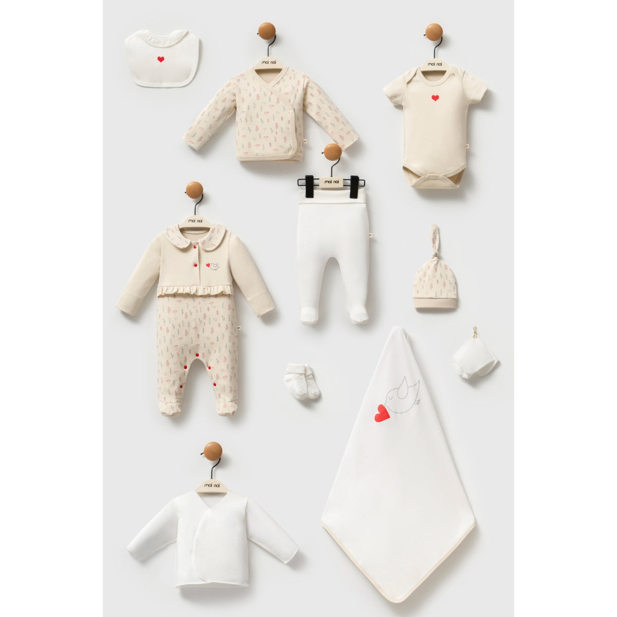 Bu 0–3 ay kişiselleştirilebilir Kokina 10’lu set, organik pamuk dokusuyla bebeğinizin cildine yumuşacık bir dokunuş sunar.