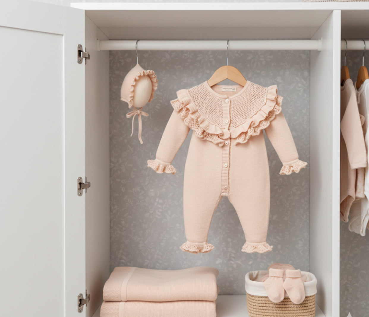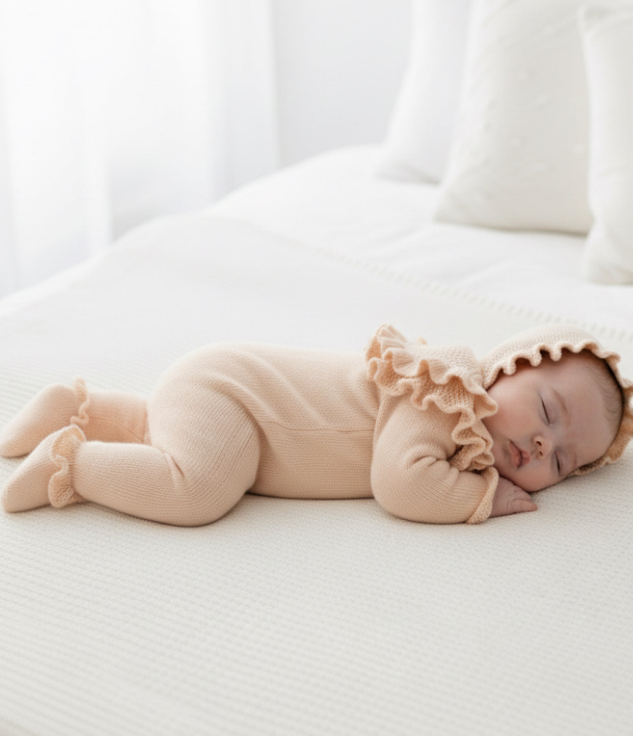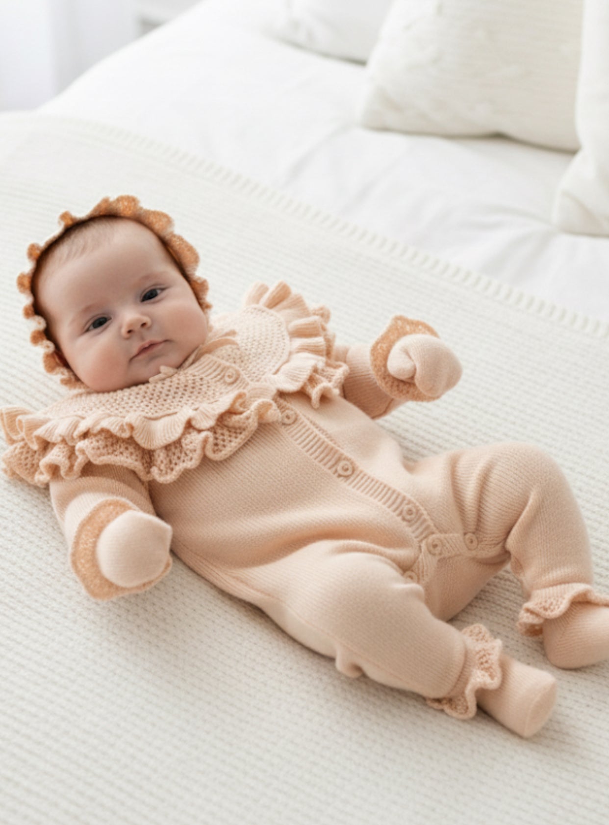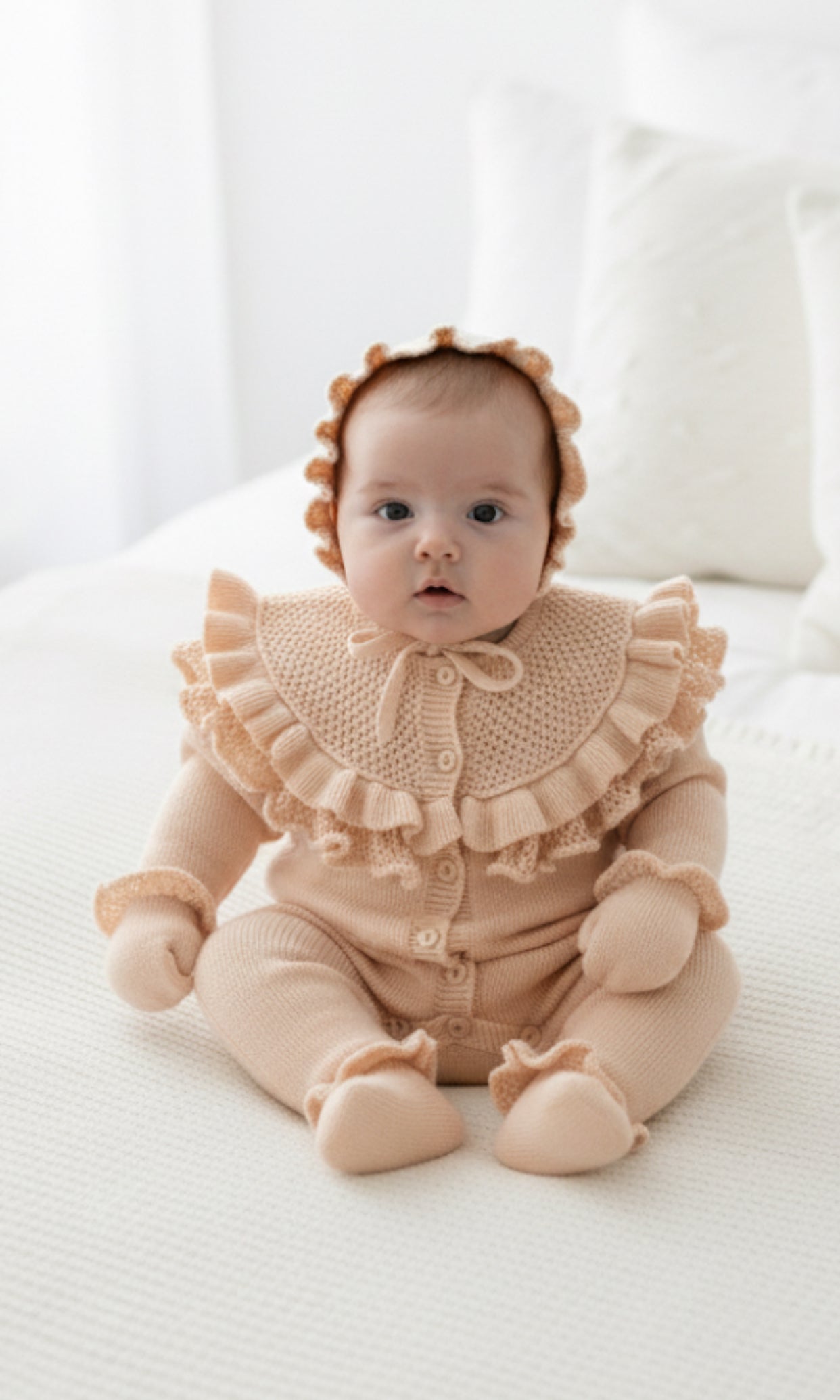 Bu yenidoğan kız bebek 5’li triko set, ilk günlerde sıcak, konforlu ve şık bir deneyim sunar. Fırfırlı yakası ve ince işçiliği ile bebeğinize zarafet katar.