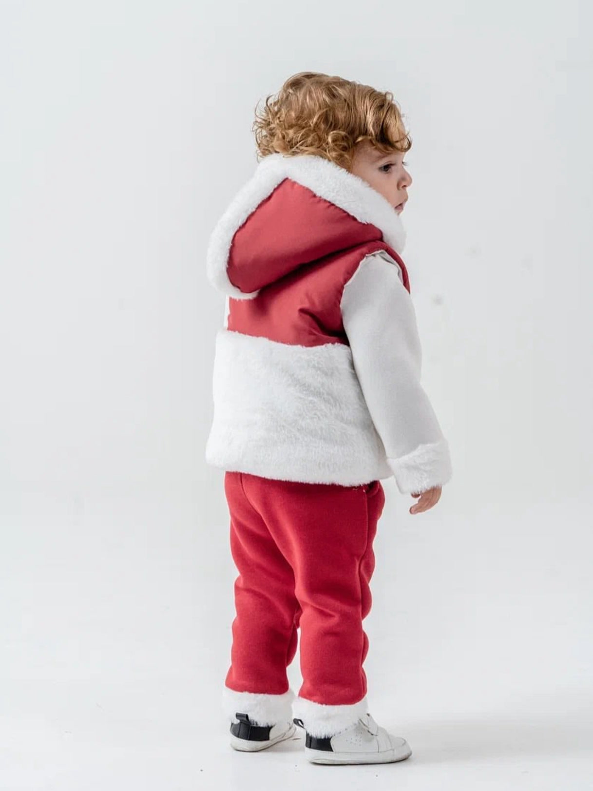 Peluş detaylı kapüşonlu mont, yılbaşı baskılı yumuşak sweatshirt ve pamuklu kırmızı pantolon ile tamamlanan bu takım, hem konforlu hem de son derece şık.