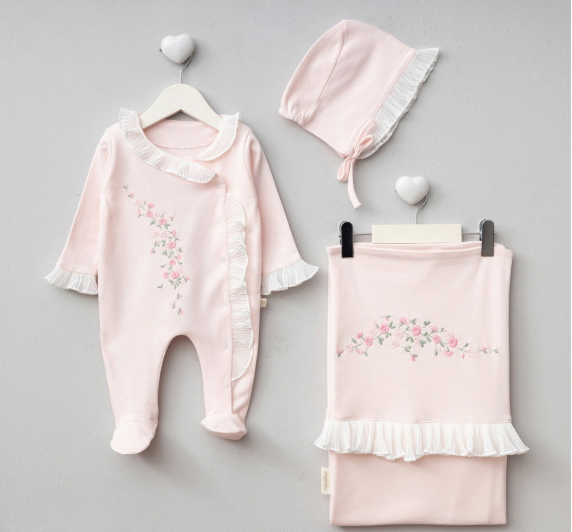 Pembe Fırfır Detaylı Çiçek Nakışlı 3 Parça Yenidoğan Hastane Çıkış Seti | 0-3 Ay Kız Bebek 9126PG