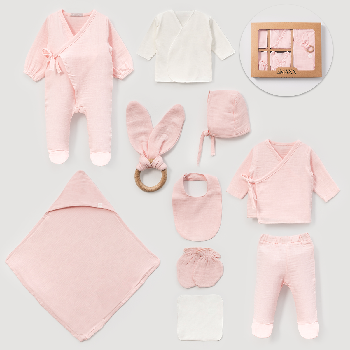 Yeni Doğan Müslin 10’lu Hastane Çıkış Seti – %100 Pamuk, Yumuşak Muslin Kumaş 60003LV